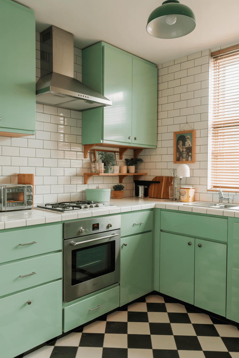 Mintgrønt er en leken og nostalgisk farge som bringer et hint av retro sjarm inn i kjøkkenet uten å bli kitschy eller overdrevet. Mintgrønne skap kombinert med hvite fliser, krom detaljer og et svart og hvitt gulv gir kjøkkenet et tidløst femtitalls uttrykk som er både morsomt og elegant. Dette er et uttrykk som fungerer særlig godt i mindre kjøkken og leiligheter der du ønsker å tilføre personlighet og karakter uten store inngrep.
